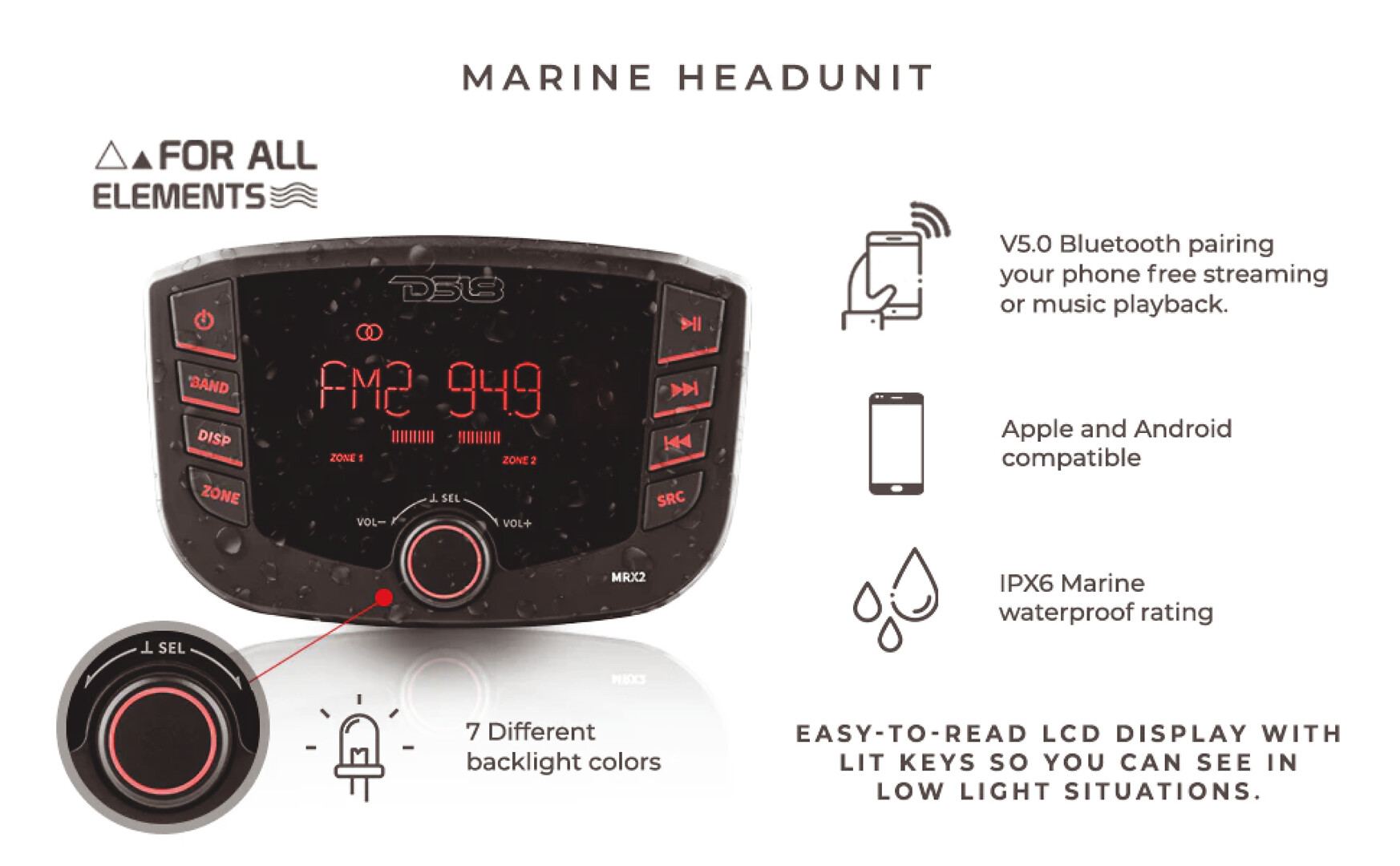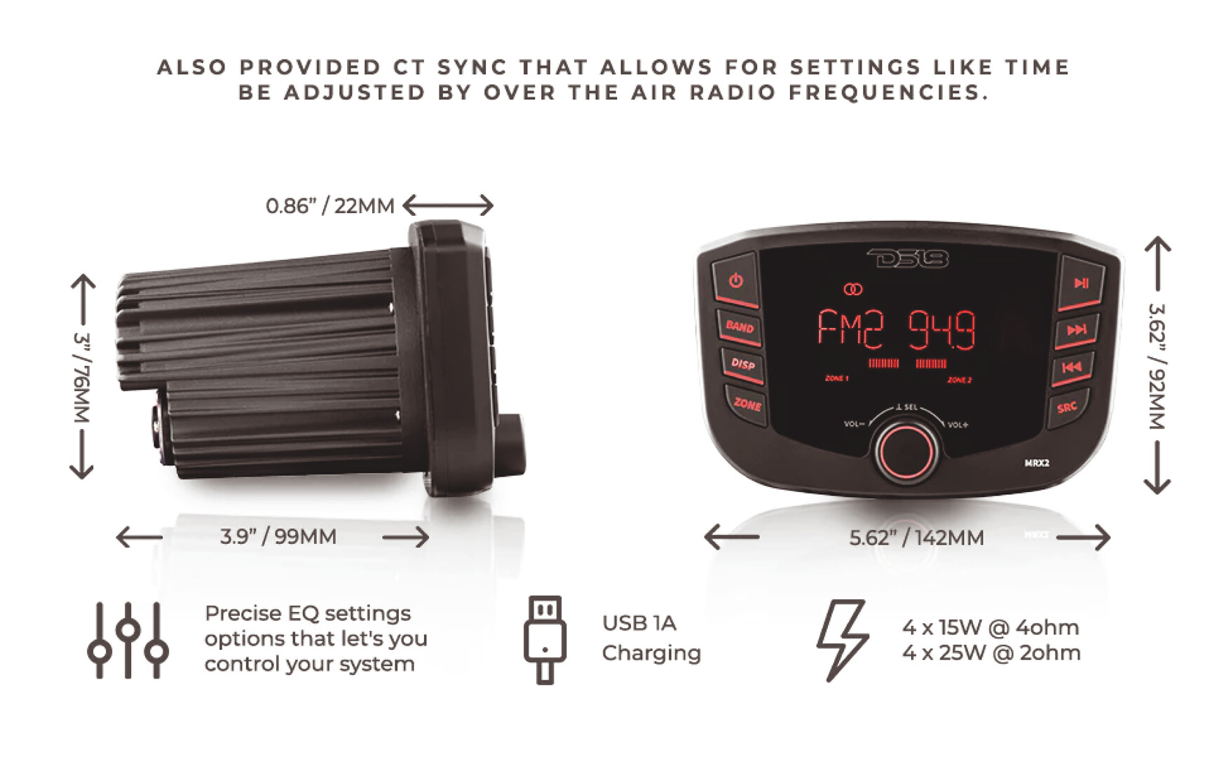 Maritim venetarvikkeet » Elektroniikka ja navigointi » Viihde-elektroniikka » Radiot ja soittimet » MRX-2 RADIO MRX-2 RADIO DS18 HYDRO MRX2 merikäyttöön tai muuhun märkään maastoon ja ankariin olosuhteisiin suunniteltu digitaalinen mediavastaanotin. 3” LCD-näyttö, kaksi RCA-vyöhykelähtöä, 4 voltin esivahvistinlähtö, helppolukuinen LCD-näyttö, RDS 4 X 50 wattia.Yksi soitin on vesillä ylitse muiden! Tämä vastaanotin on helppokäyttöinen, tyylikäs ja kestää kovaa käyttöä mm. veneissä, mönkijöissä ja maastoautoissa. Tässä tehokkaassa soittimessa on kaikki tarvitsemasi toiminnot, kuten BT, RCA-lähdöt mukaan lukien subwoofer, USB-yhteys ja lataus - sen lisäksi laite on täysin vesitiivis! Nämä asiat ovat avainasemassa laadukkaan kovaäänisen musiikin kuuntelemiseen veneessä, mönkijässä tai missä tahansa ajoneuvossa, joka altistuu usein vedelle. Lisätiedot › 308,00 € Määrä Lisää ostoskoriin Saatavuus Varastossa (3 kpl) Nopea toimitus 14 päivän palautusoikeus Kaikki yli 150 € tilaukset rahtivapaasti Nöytä toimituskuluarvio Tuotekuvaus • V5.0 Bluetooth-pariliitostoiminnot, jotta voit toistaa musiikkia suoraan puhelimestasi tai mistä tahansa BT-lähteestä.• Tarkat ääniasetukset, joiden avulla voit hallita bassoa, diskanttia, balanssia, etu-takahäivytystä, toistoaluetta, taajuuskorjainta, äänenvoimakkuudentasausta ja subwooferin suodinta helposti.• Helppolukuinen LCD-näyttö, jossa on valaistut näppäimet, jotta näet hämärässä.• Mukana on myös CT-synkronointi, joka mahdollistaa asetusten, kuten ajan, säätämisen radiotaajuuksilla.• USB voi siirtää musiikkia ja samalla ladata laitettasi nopeudella 2A.• MRX2:n äänilähtöä ei voita mikään, koska tämä laite on tehty käyttämään 4 V:n esivahvistinlähtöjä, joten voit odottaa korkealaatuisinta ääntä vahvalla jännitteellä.• MRX2:ssa on 3 ulostuloa, jotka mahdollistavat täysin asennettujen järjestelmien mukauttamisen helposti etu-, taka- ja subwooferin korkealaatuisten ulostulojen avulla.• IP65-vedenpitävyysluokitus auttaa sinua pysymään varmana käyttäessäsi laitetta ankarassa ja märässä maastossa ilman vikoja.• 2 RCA-vyöhykelähtöä, jotta voit miksata musiikkisi niiden välillä.• Tämä radio on hämmästyttävän tehokas. 4 ohmin kuormalla 4x15 wattia RMS ja 2 ohmin kuormalla 4x25 wattia RMS, mikä riittää useimpiin alemman tason kaiuttimiin. (Tornikaiuttimien ja subwooferien asentaminen edellyttää vahvistinta)• Nauti kaikista AM/FM-suosikkiasemistasi laajakaistaisella AM/FM-vastaanottimella, joka on valittavissa lähdevalitsimesta. Pakkauskoko 1 Kpl Näytä lisää tuotteitaRadiot ja soittimet tuoteryhmästä