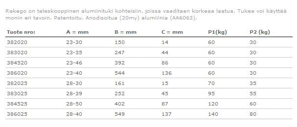 Maritim venetarvikkeet » Lukot ja saranat » Tuet ja pitimet » Pöydän ja tason tuet/ pitimet » RAKEGO ALUMIINITUKI 247MM RAKEGO ALUMIINITUKI 247MM Lisätiedot › 59,00 € Määrä Lisää ostoskoriin Saatavuus Varastossa (29 kpl) Nopea toimitus 14 päivän palautusoikeus Kaikki yli 150 € tilaukset rahtivapaasti Nöytä toimituskuluarvio Tuotekuvaus Pöydän tai työtason pidin, teleskooppinen alumiiniputki. Pakkauskoko 1 Kpl Näytä lisää tuotteitaPöydän ja tason tuet/ pitimet tuoteryhmästä