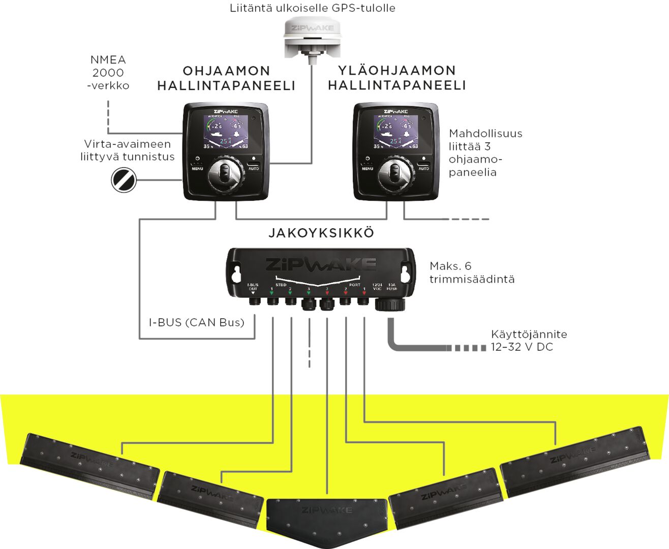 Maritim venetarvikkeet » Moottoritarvikkeet » Trimmijärjestelmät » Trimmisarjat » ZIPWAKE TRIMMISARJA 450MM ZIPWAKE TRIMMISARJA 450MM Zipwake Series S parantaa ajomukavuutta, polttoainetaloudellisuutta ja turvallisuutta. Järjestelmä koostuu nopeista ja kestävistä trimmisäätimistä sekä intuitiivisesta 3D-ohjauspaneelista, joiden avulla hallitset trimmikulmaa, kallistusta ja suuntaa tarkasti. Toiminta on täysin automaattista. Suunniteltu liukuville ja puoliliukuville veneille, joiden pituus on enintään 50 jalkaa ja huippunopeus jopa 60 solmua. Lisätiedot › 2 550,00 € Määrä Lisää ostoskoriin Saatavuus Varastossa (5 kpl) Nopea toimitus 14 päivän palautusoikeus Kaikki yli 150 € tilaukset rahtivapaasti Nöytä toimituskuluarvio Tuotekuvaus Auto Pitch Control säätää pituustrimmiä reaaliaikaisesti ajotilanteen mukaan. Lopputuloksena nopeampi kiihtyvyys, laajempi liukunopeuden alue ja parempi näkyvyys ajon aikana.Active Roll Control vakauttaa veneen automaattisesti sivuttaiskallistuksen suhteen muuttuvissa olosuhteissa, kuten tuulessa, kuormamuutoksissa tai aallokossa. Käännökset pysyvät hallinnassa kaikilla nopeuksilla, mikä tekee matkanteosta sujuvaa ja turvallista.Zipwaken vesitiivis ja selkeä ohjauspaneeli on suunniteltu käytettäväksi kaikissa valaistusolosuhteissa. Auringonvalossa hyvin näkyvä värinäyttö ja 'Auto'-painike mahdollistavat täysin automaattisen trimmauksen käyttöönoton yhdellä painalluksella.Sarja sisältää:2 x Trimmilevyä, mukana 3 metrin kaapelit ja kaapelisuojat.1 x Jakoyksikkö, mukana 4 metrin virtakaapeli.1 x Ohjauspaneeli, mukana 7 metrin vakiokaapeli.Malli: IT450-S Pituus: 450 mm (18 tuumaa)Paino: 2.8 kg (6.2 lbs)Maksiminopeus: 60 solmuaTerän liike: 30 mm (1.2 tuumaa)Terän nopeus: 20 mm/s (0.8 tuumaa/s)Kaapelin pituus: 3 m (10 jalkaa), laajennettavissa 6 metriin (20 jalkaa)Käyttöjännite: 12–32 V DCTehonkulutus: 25 W maksimiKäyttölämpötila: 0° – +40°C (+32° – +104°F)Säilytyslämpötila: -40° – +90°C (-40° – +194°F)Vesitiiviys: IP68 (5 m syvyydessä)Yhteensopivuus: CE, FCC Pakkauskoko 1 SRJ Näytä lisää tuotteitaTrimmisarjat tuoteryhmästä