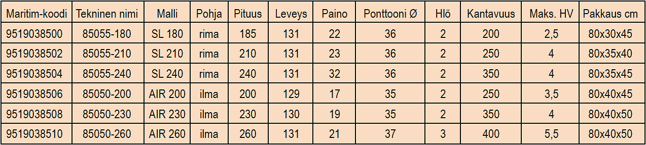 Maritim venetarvikkeet » Venevarusteet » Kumiveneet ja vesiurheiluvälineet » Kumiveneet » CREWTENDER KUMIVENE 200CM ILMAPOHJA CREWTENDER KUMIVENE 200CM ILMAPOHJA Crewtender-kumiveneet ovat korkealaatuisia, edullisia ja sopivat niin yhteysveneeksi kuin yleiskäyttöönkin. Voit valita joko rimapohjaisen; pieneen tilaan mahtuvan, helposti kasattavan ja pakattavan, tai ilmapohjaisen, hyvän ajomukavuuden tarjoavan mallin. Kaikki mallit ovat helposti mukana kuljetettavia ja hyvin varusteltuja. Lisätiedot › 799,00 € Määrä Lisää ostoskoriin Saatavuus Varastossa (2 kpl) Nopea toimitus 14 päivän palautusoikeus Kaikki yli 150 € tilaukset rahtivapaasti Nöytä toimituskuluarvio Tuotekuvaus Valmistusmateriaali, keulan vetolenkit, perän RST-silmukkapultit ja kuminen koko veneen kiertävä törmäyslista tekevät veneestä laadukkaan ja kestävän. Veneet sopivat laajalle valikoimalle sähkö- ja perämoottoreita.Ominaisuudet:• kompakti• nopea täyttö ja tyhjennys• tukeva kuminen törmäyslista • 2 kpl RST-vetolenkkiä keulassa• 2 kpl RST-silmukkapultteja peräpeilissä• pikatäyttöventtiilit• turvallisuuden ja kestävyyden vuoksi tylpät takakulmatPakkaus sisältää:• jalkapumppu• korjaussarja• airot• kantolaukku• kiinnitysköysi• siirrettävä istuin Pakkauskoko 1 Kpl Näytä lisää tuotteitaKumiveneet tuoteryhmästä