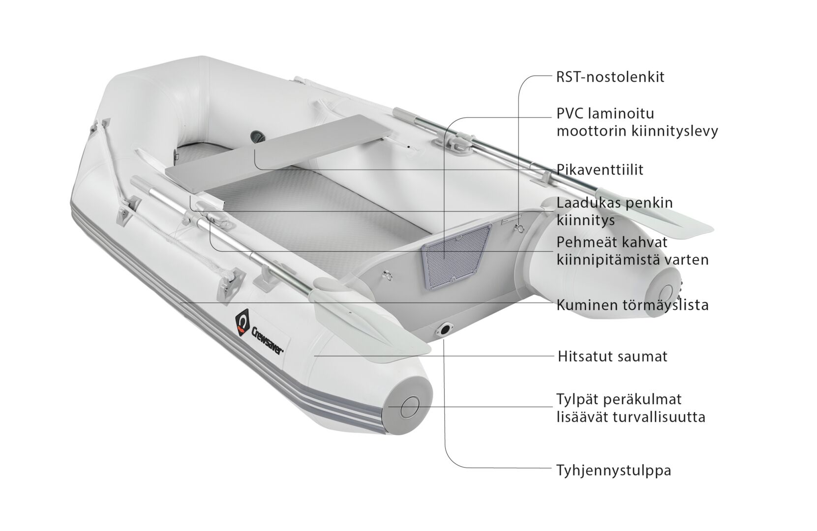 Maritim venetarvikkeet » Venevarusteet » Kumiveneet ja vesiurheiluvälineet » Kumiveneet » CREWTENDER KUMIVENE 240CM RIMAPOHJA CREWTENDER KUMIVENE 240CM RIMAPOHJA Crewtender-kumiveneet ovat korkealaatuisia, edullisia ja sopivat niin yhteysveneeksi kuin yleiskäyttöönkin. Voit valita joko rimapohjaisen; pieneen tilaan mahtuvan, helposti kasattavan ja pakattavan, tai ilmapohjaisen, hyvän ajomukavuuden tarjoavan mallin. Kaikki mallit ovat helposti mukana kuljetettavia ja hyvin varusteltuja. Lisätiedot › 747,00 € Määrä Lisää ostoskoriin Saatavuus Varastossa (6 kpl) Nopea toimitus 14 päivän palautusoikeus Kaikki yli 150 € tilaukset rahtivapaasti Nöytä toimituskuluarvio Tuotekuvaus Valmistusmateriaali, keulan vetolenkit, perän RST-silmukkapultit ja kuminen koko veneen kiertävä törmäyslista tekevät veneestä laadukkaan ja kestävän. Veneet sopivat laajalle valikoimalle sähkö- ja perämoottoreita.Ominaisuudet:• kompakti• nopea täyttö ja tyhjennys• tukeva kuminen törmäyslista • 2 kpl RST-vetolenkkiä keulassa• 2 kpl RST-silmukkapultteja peräpeilissä• pikatäyttöventtiilit• turvallisuuden ja kestävyyden vuoksi tylpät takakulmatPakkaus sisältää:• jalkapumppu• korjaussarja• airot• kantolaukku• kiinnitysköysi• siirrettävä istuin Pakkauskoko 1 Kpl Näytä lisää tuotteitaKumiveneet tuoteryhmästä